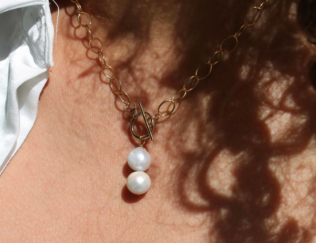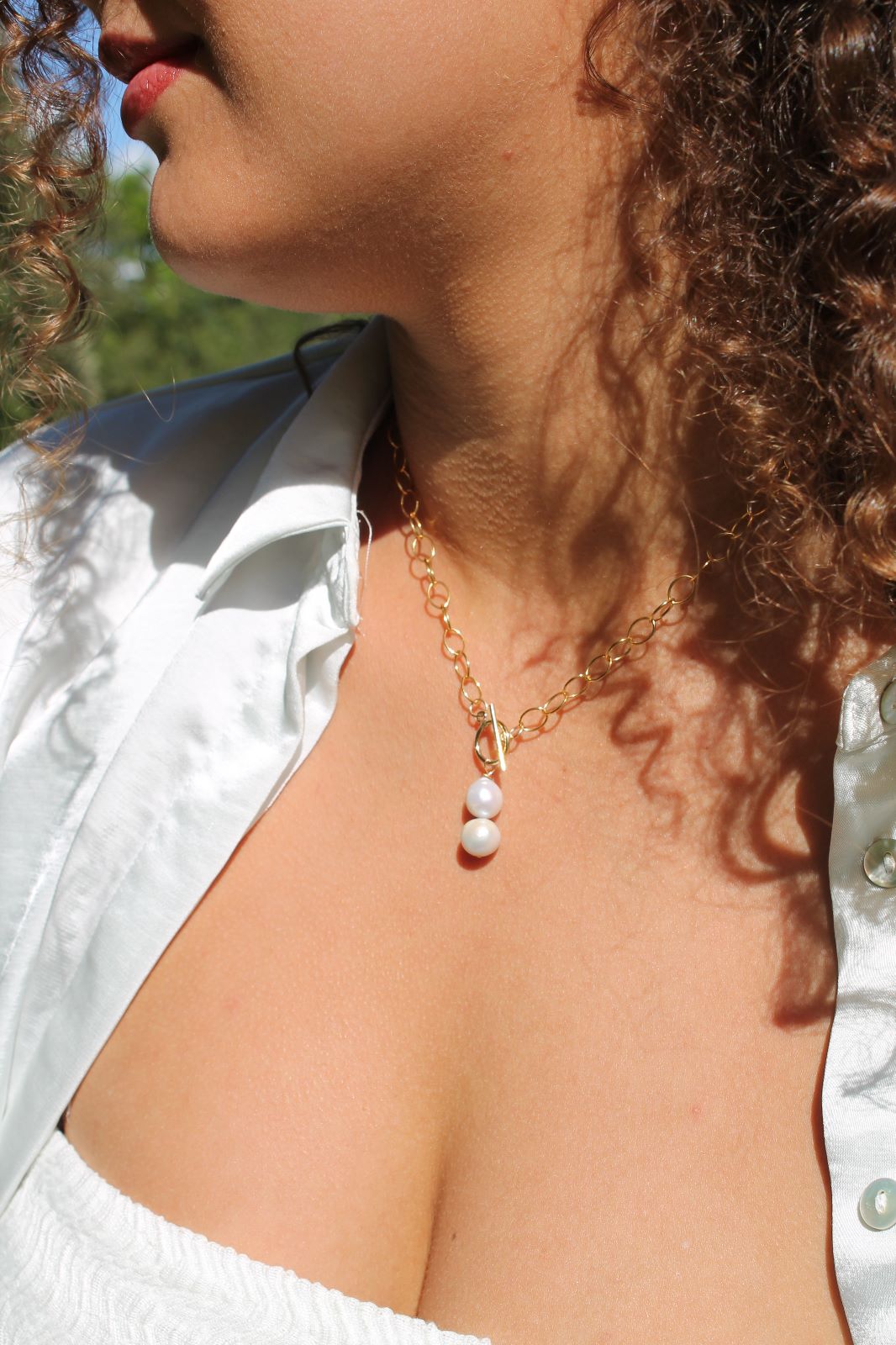 Elsa est un collier fabriqué à partir de matériaux de haute qualité. Il est conçu avec du métal gold filled. Le pendentif du collier est orné de perles d'eau douce.