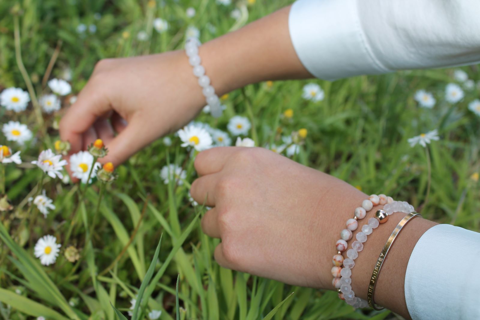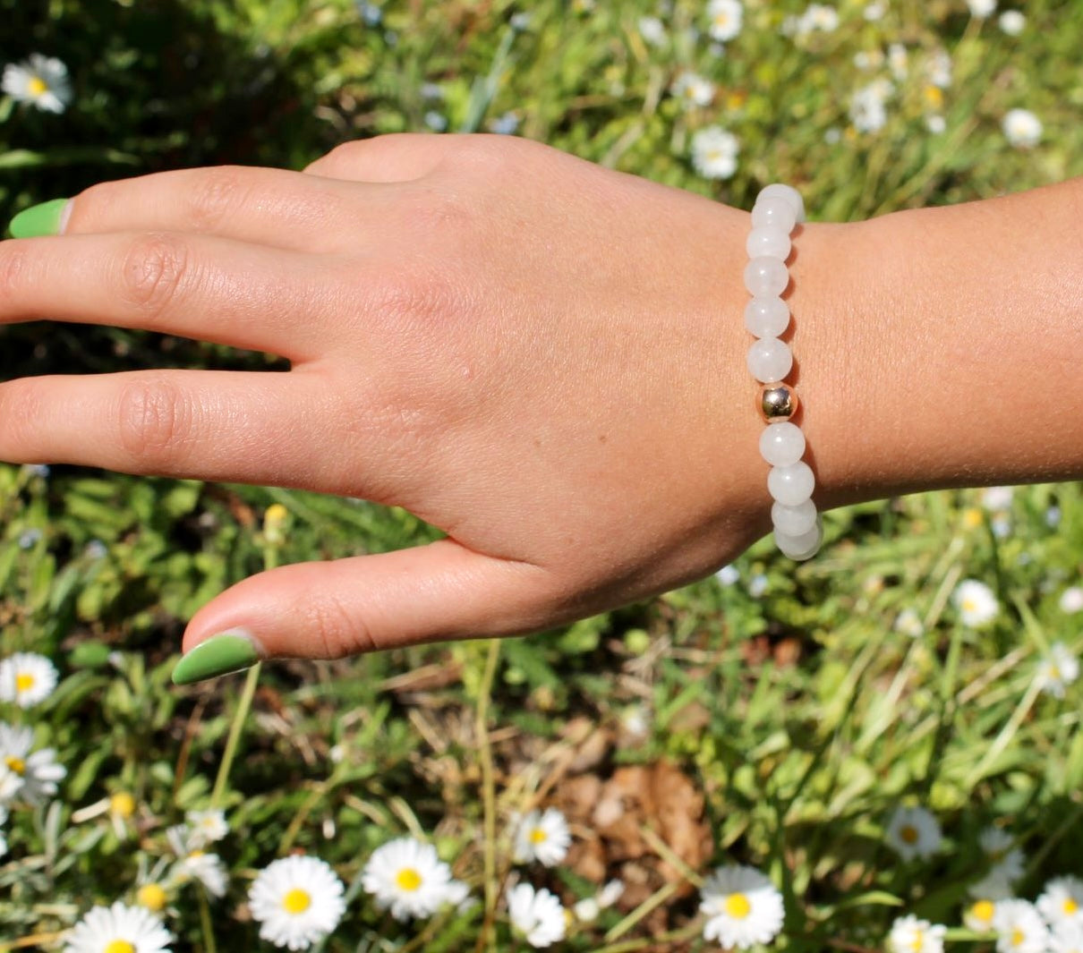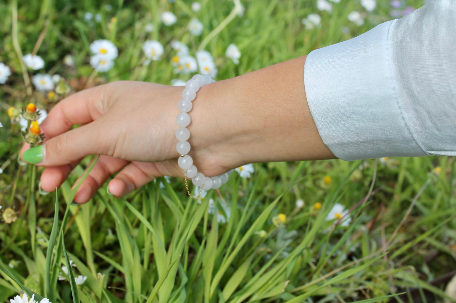 L'association du jade blanc et de la perle en gold filled crée un contraste subtil entre la pierre naturelle et l'élément métallique doré. Cela confère à Jade une esthétique à la fois délicate et luxueuse. Le jade blanc est réputé pour ses propriétés apaisantes et énergisantes, tandis que l'or symbolise la richesse et l'élégance.