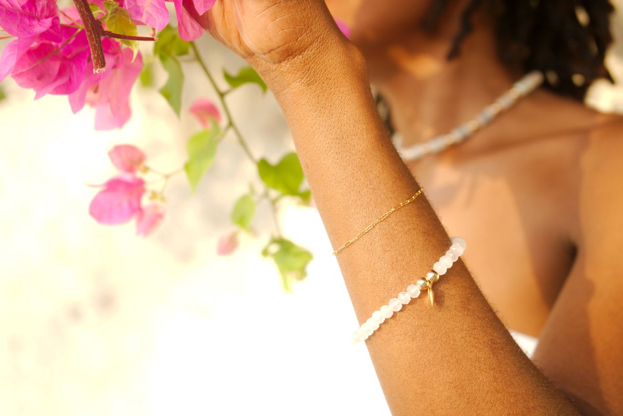 Rosalia est bracelet en pierre de rose quartz orné d'un élégant pendentif en forme de cœur plaqué or. La pierre de rose quartz est connue pour ses propriétés apaisantes et pour favoriser l'amour et la compassion, tandis que le plaqué or ajoute une touche de luxe et d'élégance à ce bijou. Le bracelet est ajustable pour s'adapter à différentes tailles de poignet, et il est idéal pour offrir en cadeau à un être cher ou pour se faire plaisir. Ajoutez une touche de douceur et d'élégance à votre tenue avec ce magnifique bracelet en pierre de rose quartz avec un cœur en plaqué or.